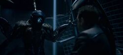 Every bit SAR closes in on the alien engine, Will and Smith return and provide everyone with the command. The Robinsons, Smith, Grant Kelly and Don W broadcast it to SAR, simply he still tries to activate the engine and accept humanity with him. Remembering Robot'south order to "Trust, Will Robinson," Will shuts down his broadcast and allows SAR to kill him in the heart again which Robot had anticipated would happen. SAR absorbs the part of Robot that had been left behind in Will'due south eye and transforms into Robot himself who shuts downward the engine, ending the war and saving Alpha Centauri.